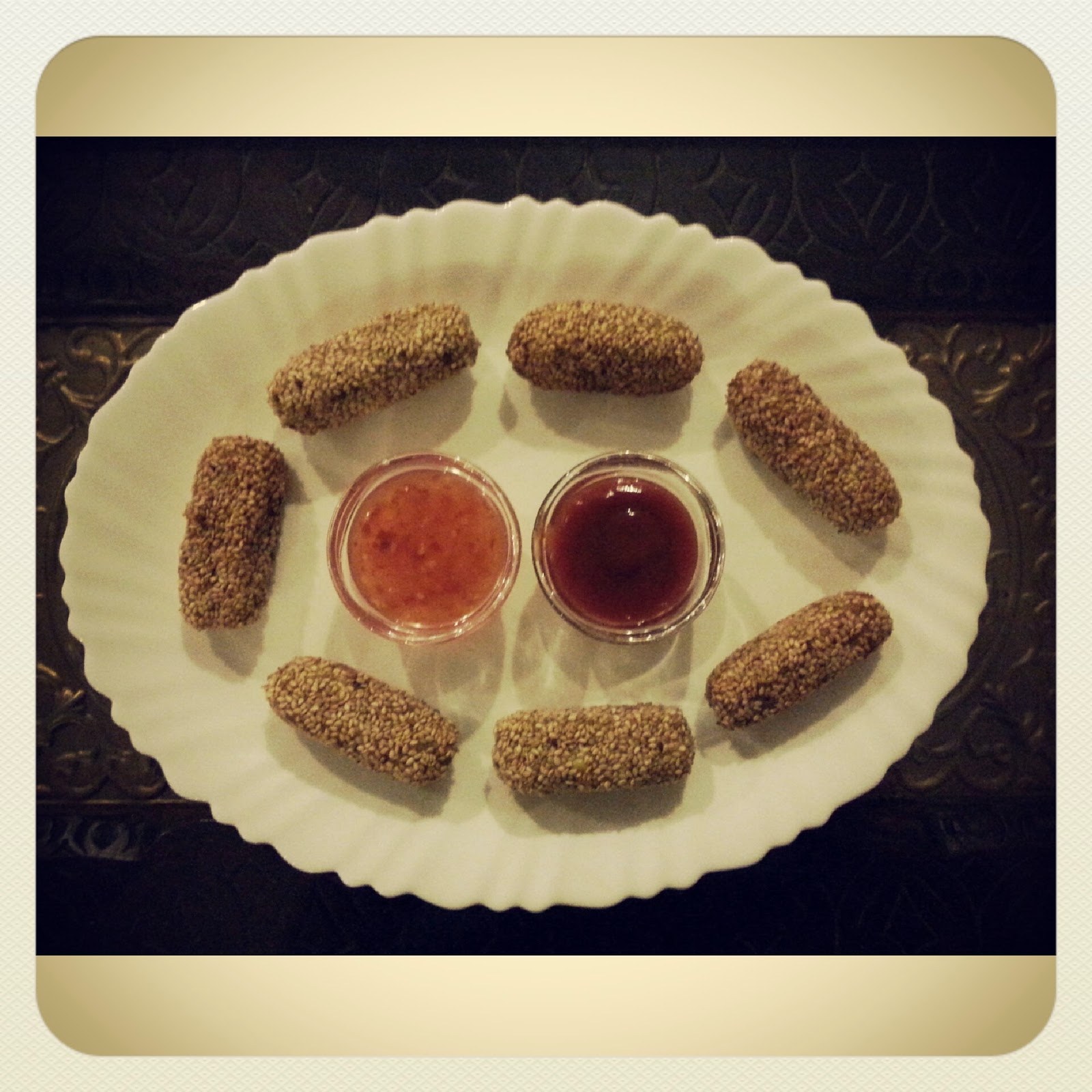 Roll them on a plate spread with sesame and coat the rolls completely with sesame.